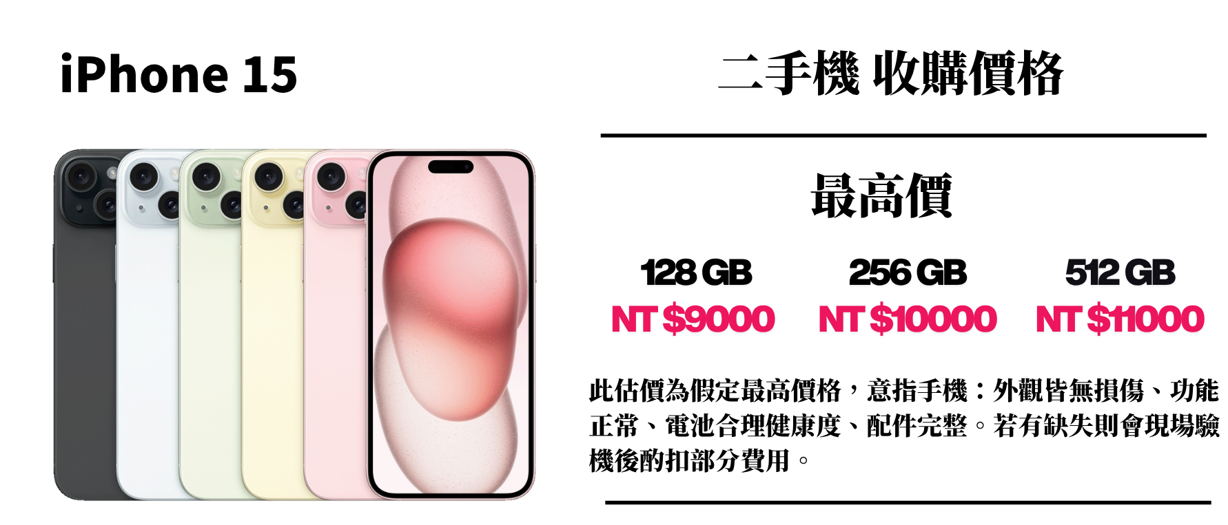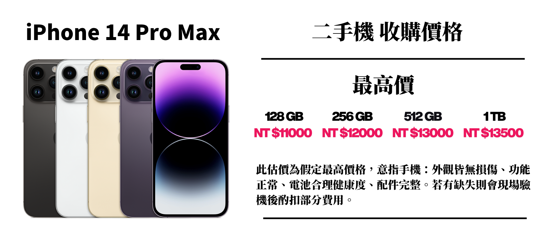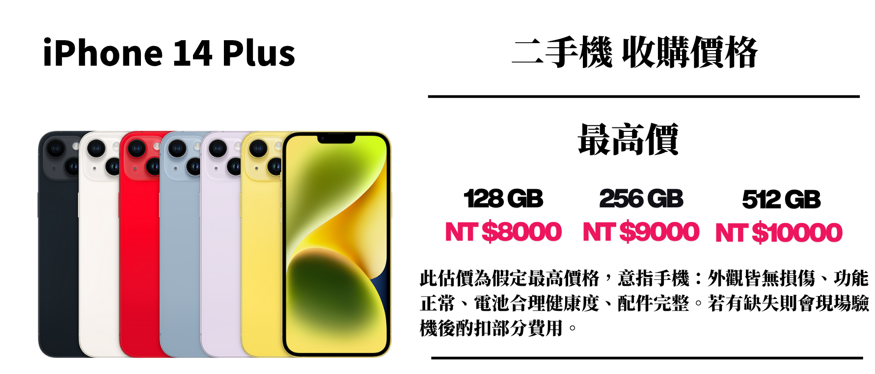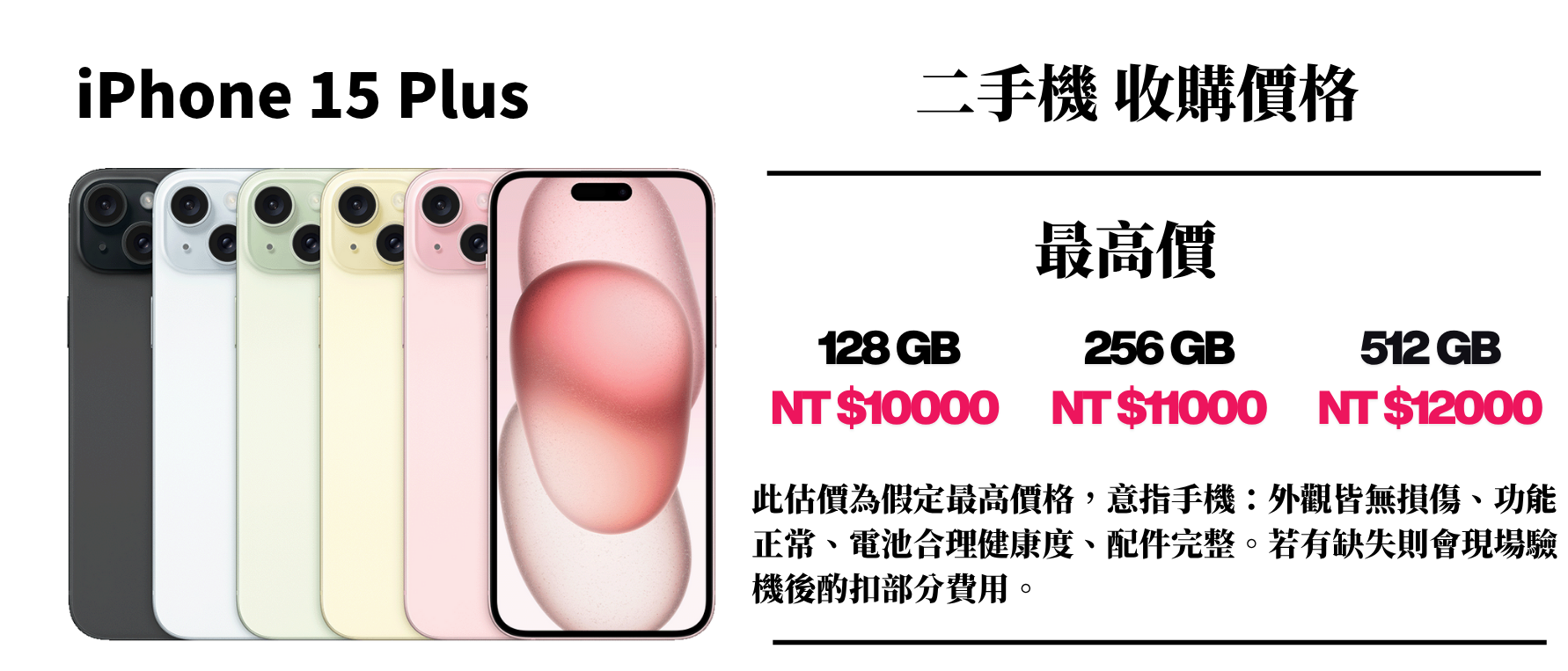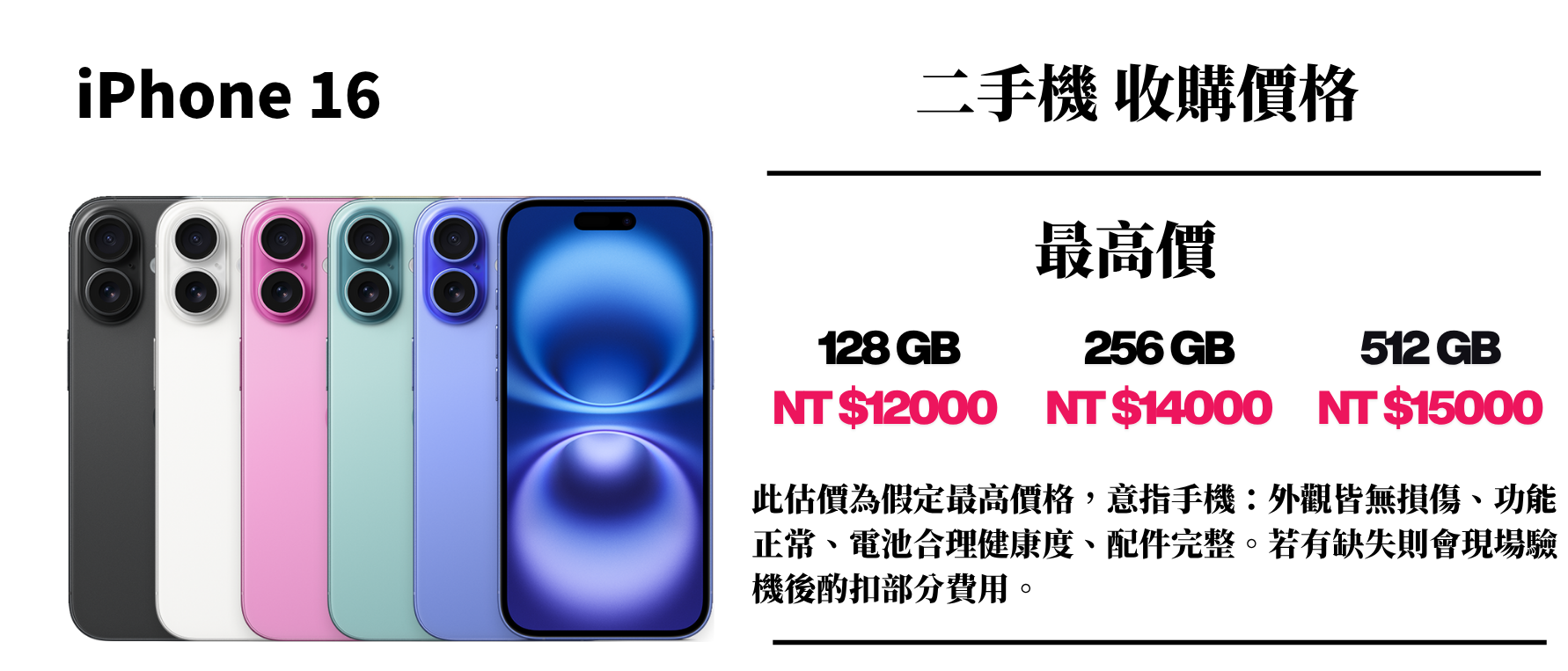 ⚠️ 此估價為假定最高價格,意指手機:外觀皆無損傷、功能正常、電池合理健康度、配件完整。若有缺失則會現場驗機後酌扣部分費用。