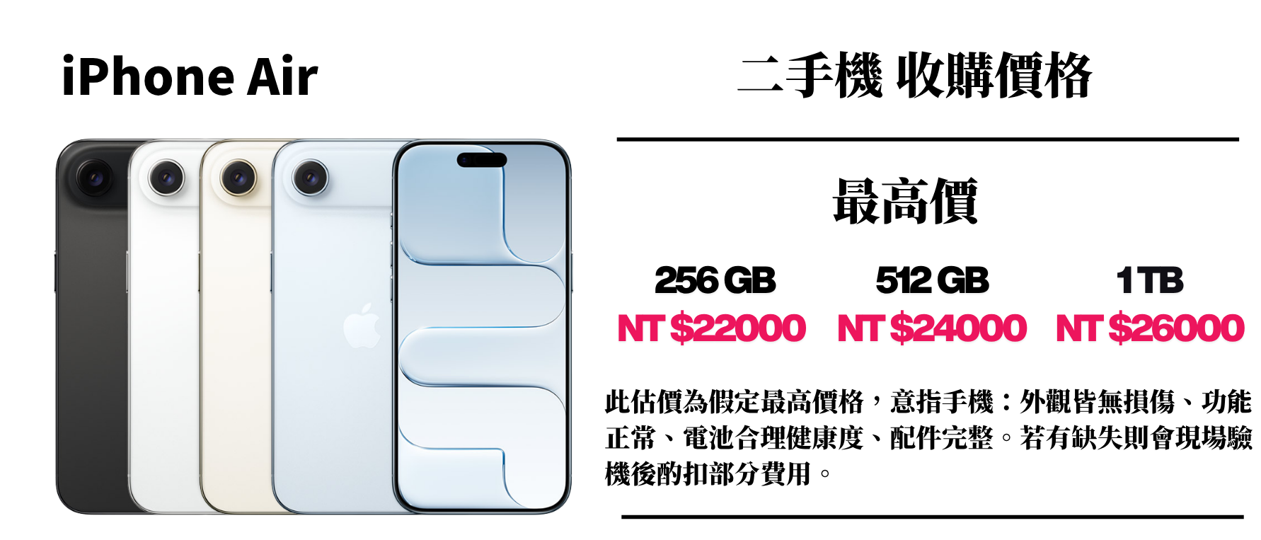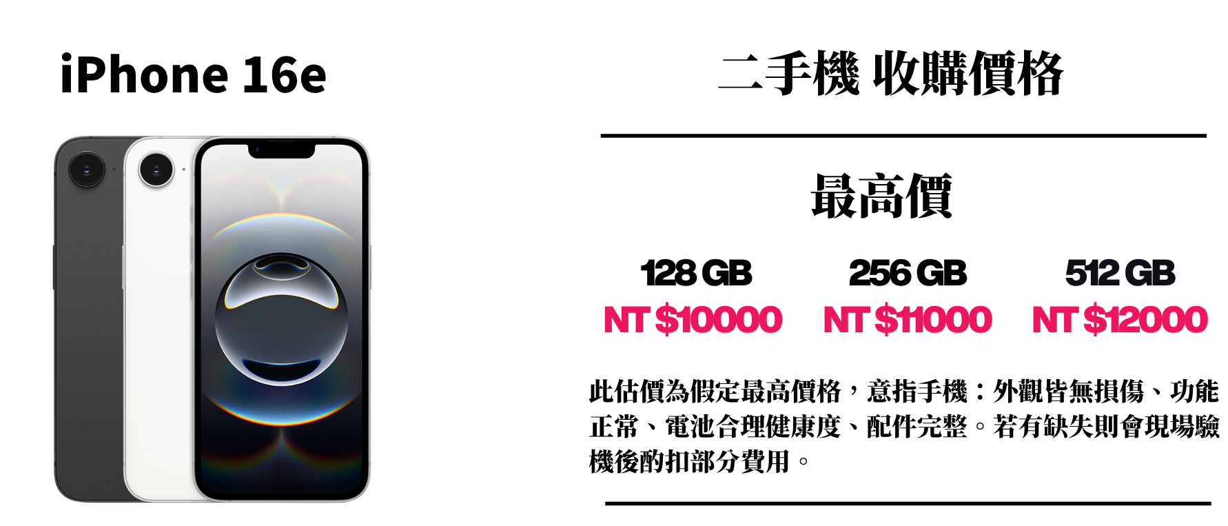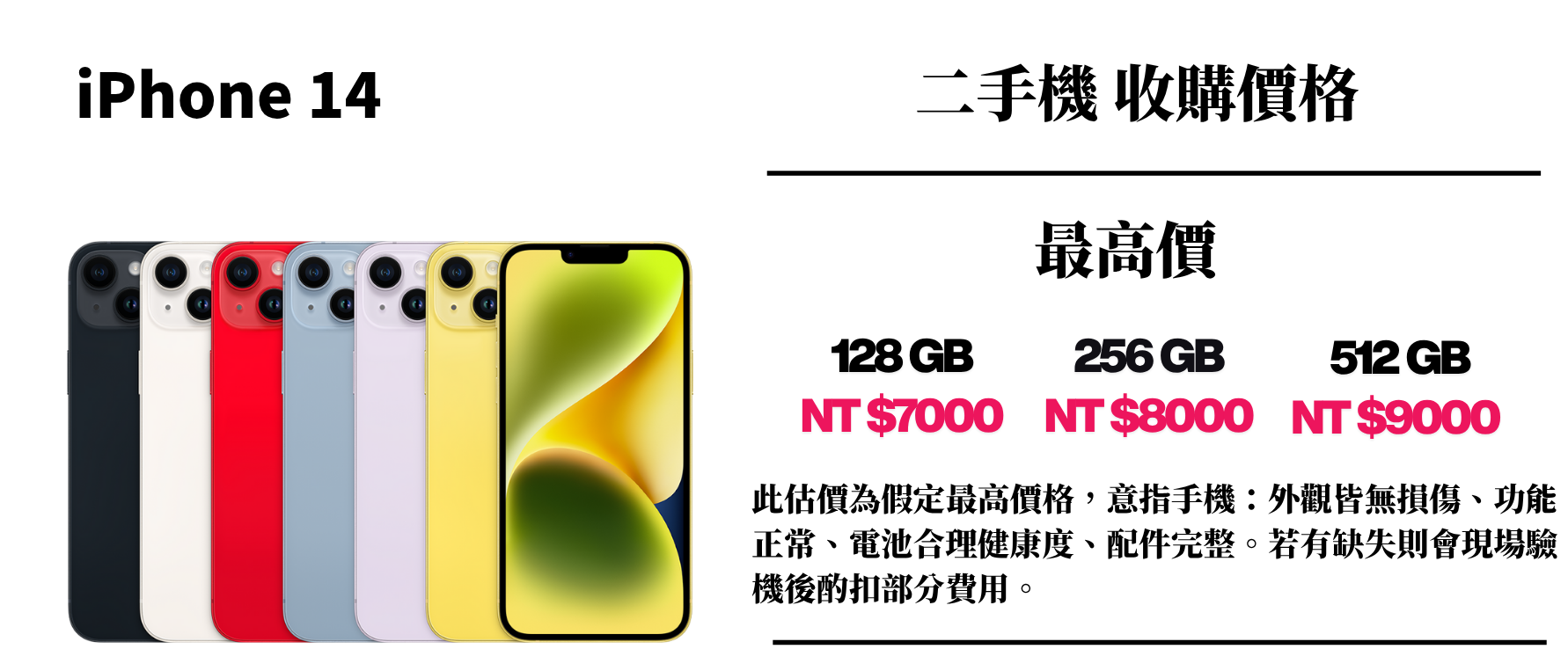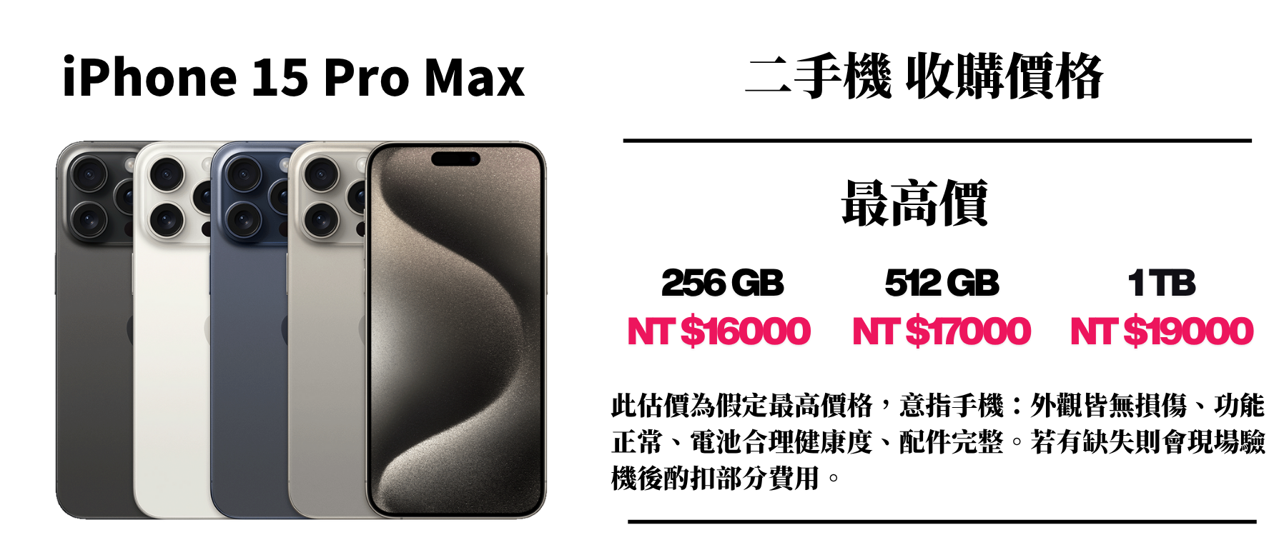 ⚠️ 此估價為假定最高價格,意指手機:外觀皆無損傷、功能正常、電池合理健康度、配件完整。若有缺失則會現場驗機後酌扣部分費用。