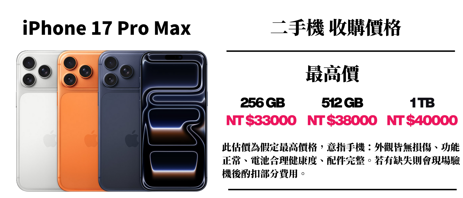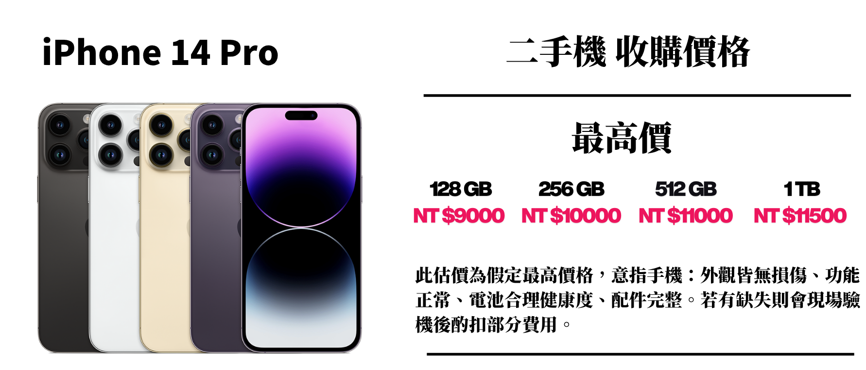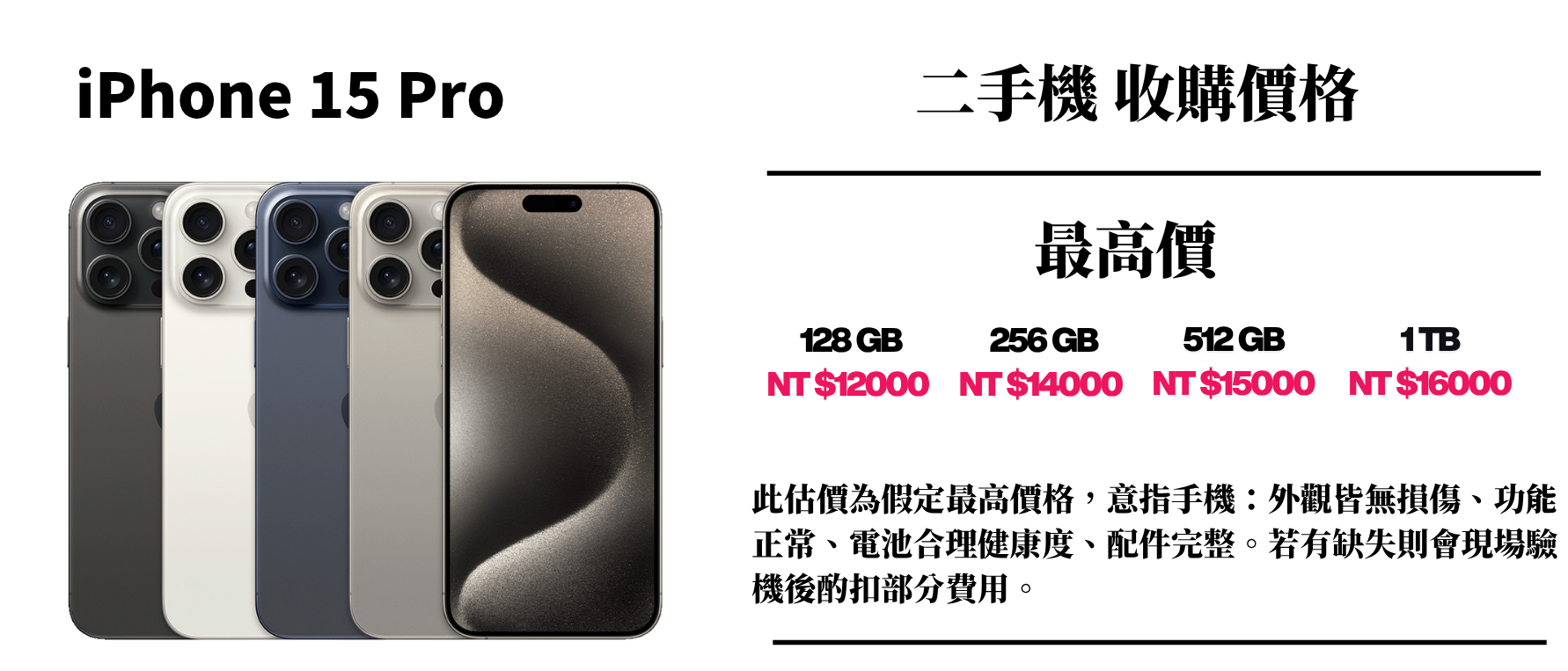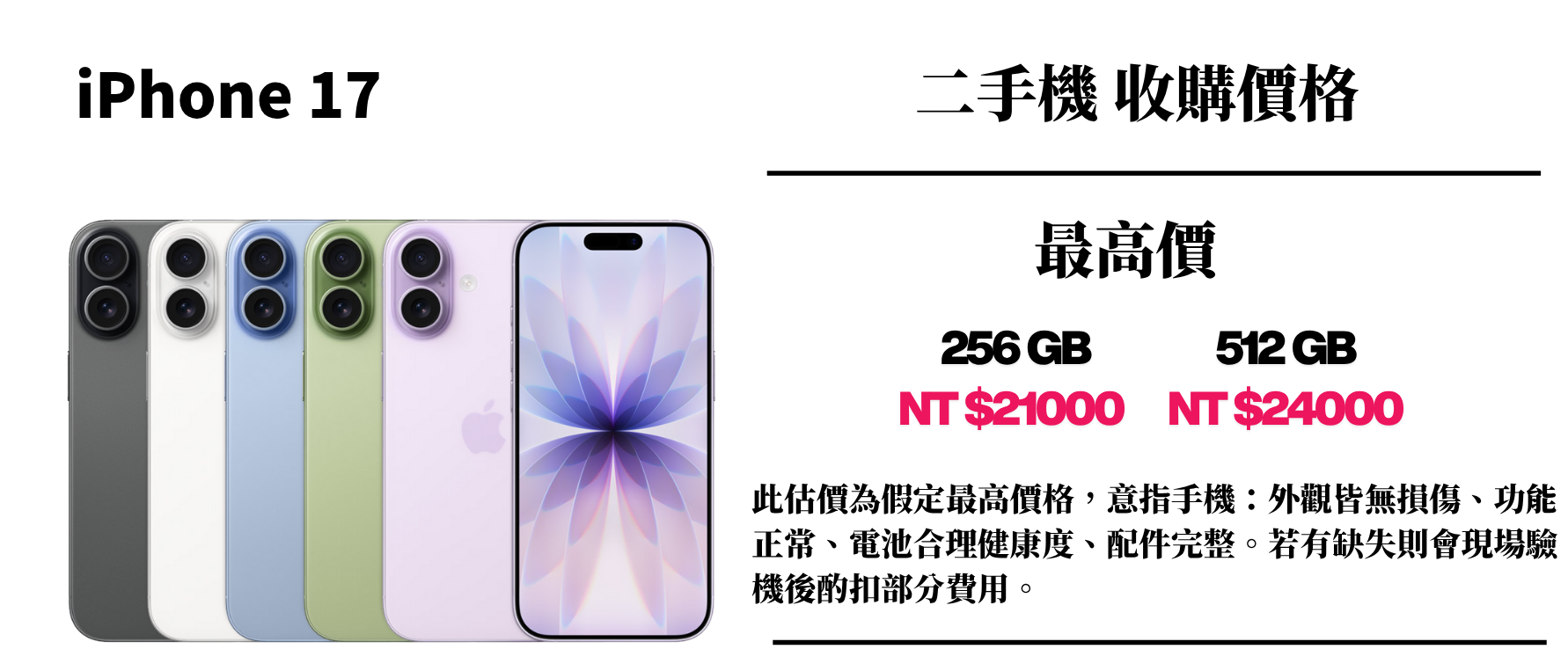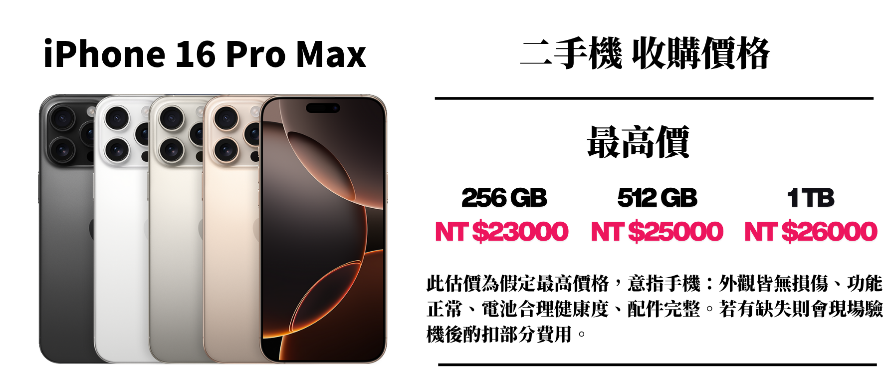 ⚠️ 此估價為假定最高價格,意指手機:外觀皆無損傷、功能正常、電池合理健康度、配件完整。若有缺失則會現場驗機後酌扣部分費用。